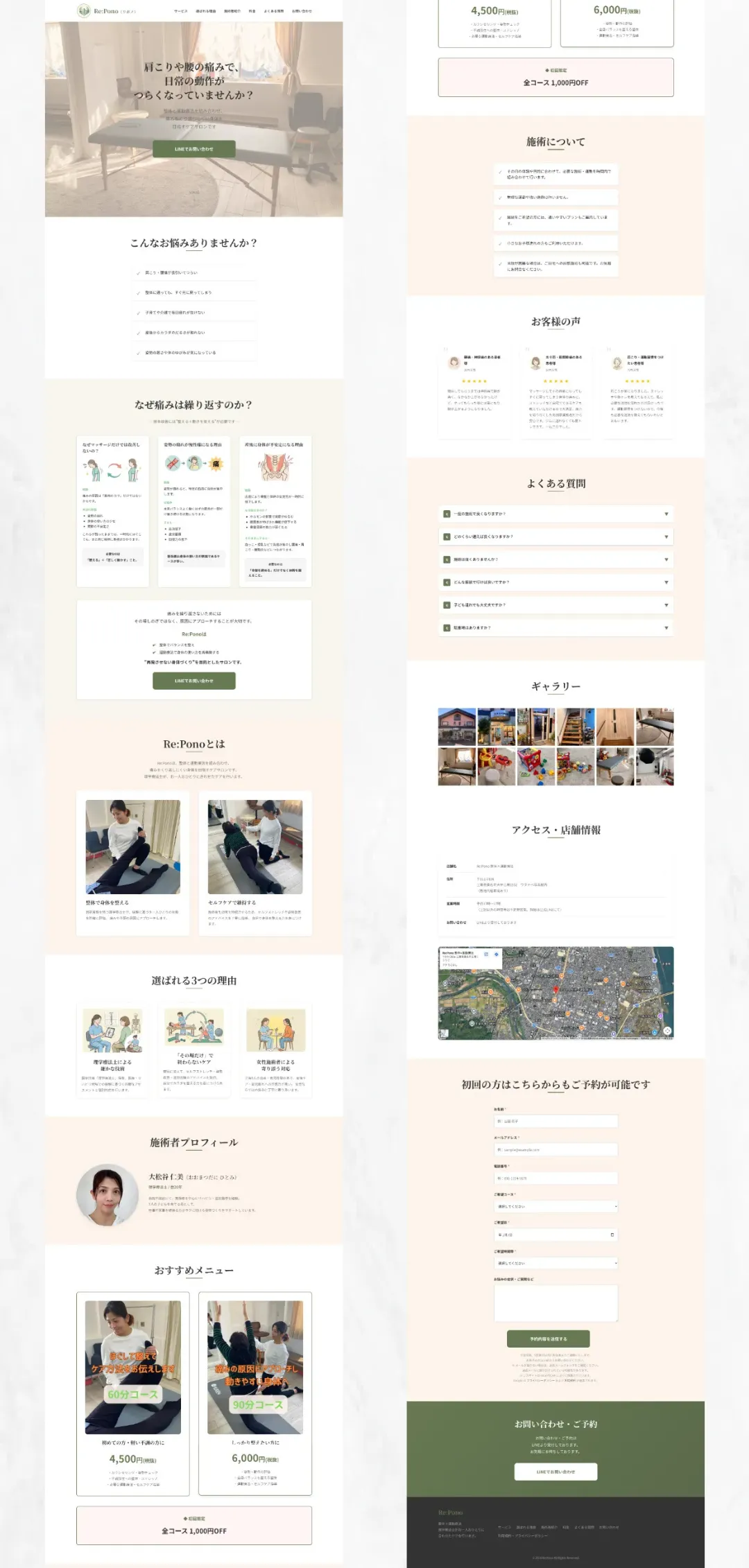 三重県にて整体×運動療法のサロンを経営されているRe:PonoさまのLPを制作させていただきました。